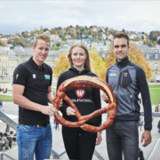 Bildunterschrift: Lisa Fischer (Mitte, Team Stuttgart) sowie Pascal Ackermann (links, Deutscher Meister 2018) und Maximilian Schachmann (rechts, Deutscher Meister) zum Start des Brezel Race