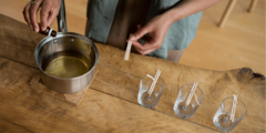Wenn du deine eigenen Duftkerzen gießen möchtest, empfiehlt sich der Kauf von Soja- oder Rapswachs, das in vielen Reformhäusern erhältlich ist.